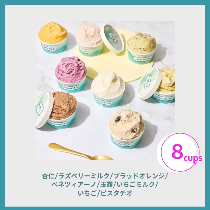 杏仁、ラズベリーミルク、ブラッドオレンジ、ベネツィアーノ、玉露、いちごミルク、いちご、ピスタチオ、8種の詰め合わせ。